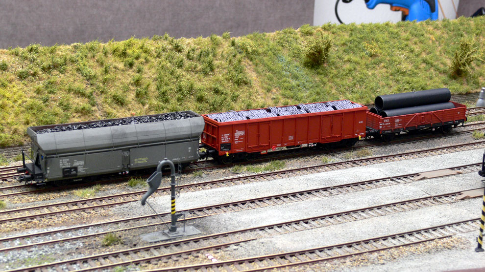 převracet jej. Proto jsem navrhl tyto základní zásady pro tvorbu nákladů: - zásadně ne volně sypané náklady (vyžadují při vyložení nutnost zvednout vůz z kolejí) - musí být ve voze volně vložený - tj. ne těsně na ložný rozměr vozu - musí být lehký - musí být kompaktní, případně na pevné podložce, zespodu označen - musí mít malé očko průměr min. 2 mm, drát 0,35 mm, nejlépe nad těžištěm nákladu pro vytažení nákladu z vozu (náklad bez tohoto vybavení není způsobilý nakládky), vytažení nákladu při vyložení "háčkem" na rozvěšování vozů, důvodem je jednotný manipulační nástroj, který má většina účastníků modulového setkání stále u sebe |