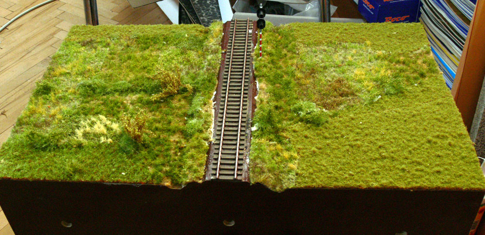 opět Ostafixem a dotmeleny Ostafixem. Na vlastní povrch krajiny jsou používány, na většině současně budovaných našich modulech, foliáže "Polák". Neobdělávané louky - zejména 4704 varianta D, strukturstat - 5954, 5964 a 5959, 5969 a ke kolejím doplňováno horskou loukou D 4804, a horskou pastvinou 4853 a 4855 varianty C, E. Z foliáží horské pastviny jsou vytrhávány trsy různých trav, které výborně dělají plynulé přerůstání vegetace do ploch štěrku, hlíny a podobně. Foliáže jsou lepeny lepidlem Herkules nebo Duvilax. |