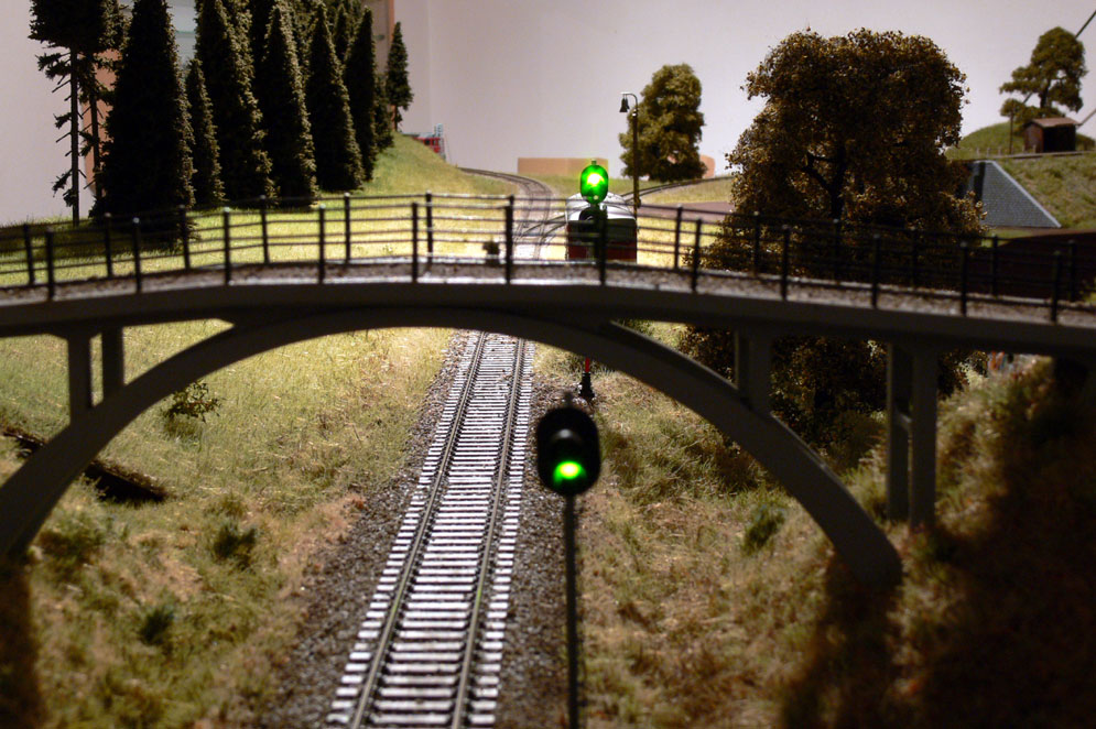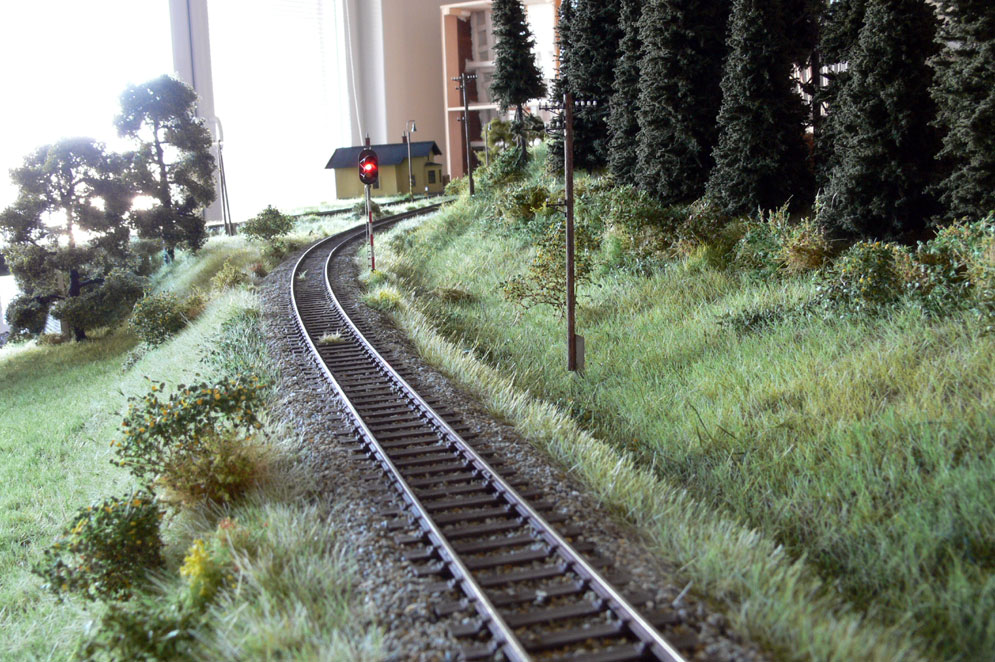 | Různá intenzita svitu návěstidel bude ještě "urovnána". Pokud se vám zdá, že některé stromy trochu padají :D , tak je to pravda, moduly stály na kolmo a některé stromy ještě nejsou vlepeny do krajiny. |
