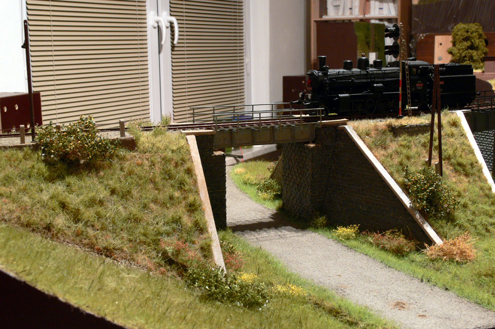 | A na Moravě je malé pokračování s dosazením telefonních sloupů (JM Detail) a stavby prvního menšího ocelového mostu (z nařezaných dílů JM Detail), chybí tam ještě pochozí plechy. Pilíře a opěrné zdi nejsou žádné hightech, je to obyčejná Malá železnice , je to nařezáno z jejich kamenných zdí a postupně je na nich prováděna barevná úprava a najdou se tam i chyby při složení, ale už jsou tam. Okolo ještě projde úpravou vegetace. |