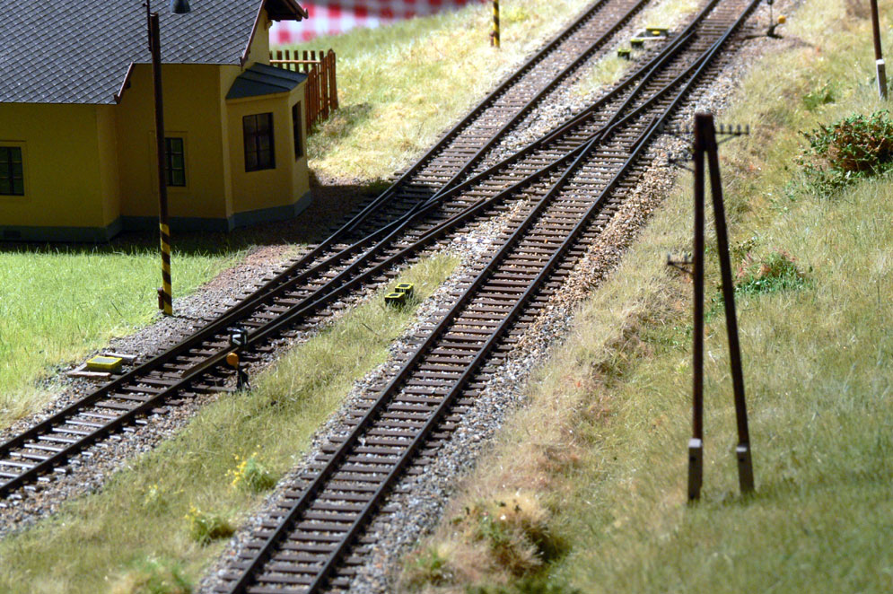 | A přibyly další drobnosti, které dotváří "železniční" vzhled - telefony u návěstidel a na budově odobočky, tabule před zastávkou, konce nástupiště, označníky - před návěstidla PL a ML. |
