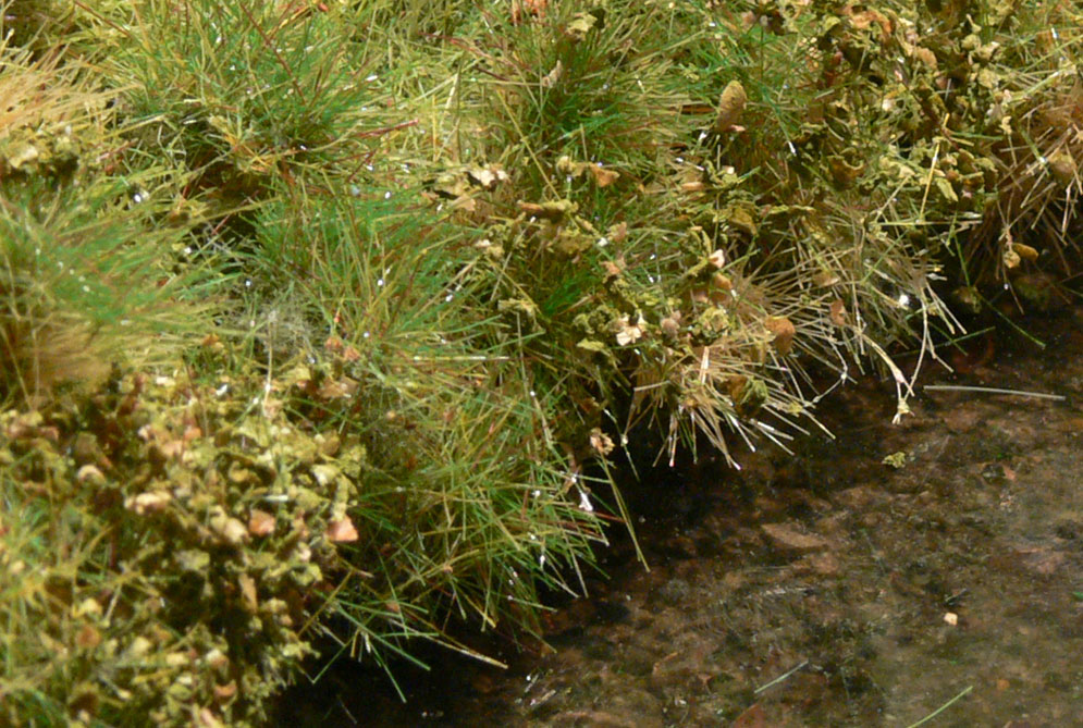 | A břeh nasáklý vodou nám lehce zarostl trsy vytrhávanými z foliáže, tentokrát pro změnu od Model Scene (práce na 15 minut). Přechod do okolní krajiny ještě dostane drobný přechodový flok. |