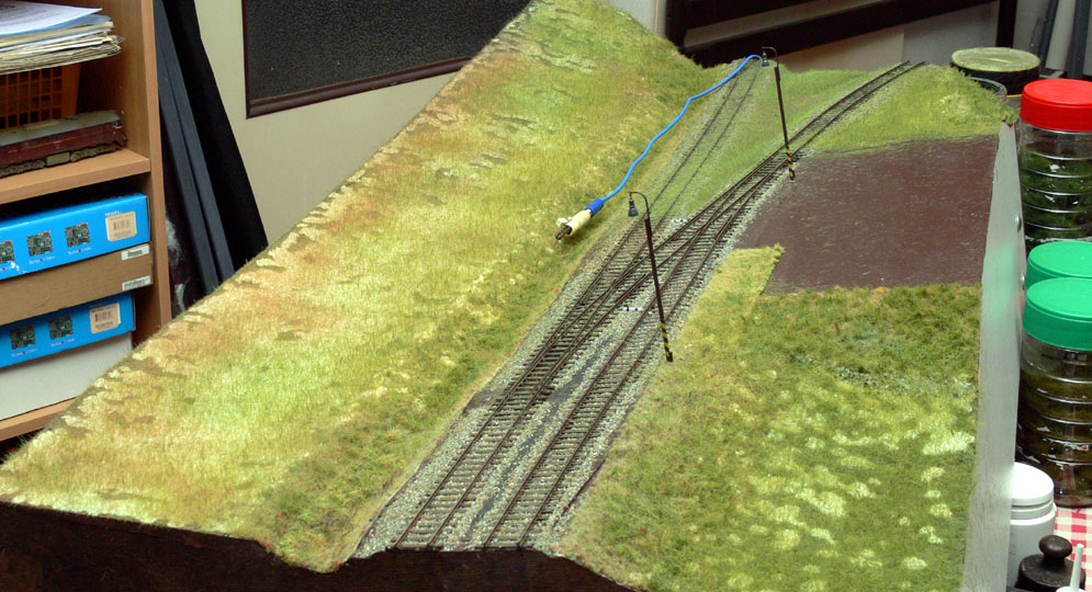 | Dnes nátěr krajiny, proletování kolejnic, tam kde jsou vodivé spoje, tam kde má být izolace je styk zakápnut sekunďákem (použito již před lety na Lipové a osvědčilo se) a zatím jen do země strčeno první návěstidlo a půlka odbočky je sjízdná. |