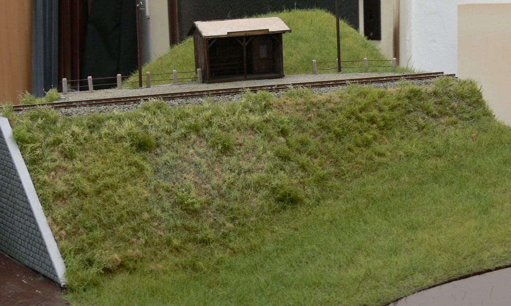 | Udělal jsem si radost a kousek náspu jsem pokryl foliáží Polák. Obecně náspy a zářezy půjdou foliáži a zbytek rovnějších ploch bude flokovaný. Na prvním náspu je použita kombinace neobdělávaných luk, doplněno trsy různých kvetoucích i nekvetoucích rostlin. Na přístřešku zastávky stále chybí střešní krytina, asi tam přijde lepenka. |