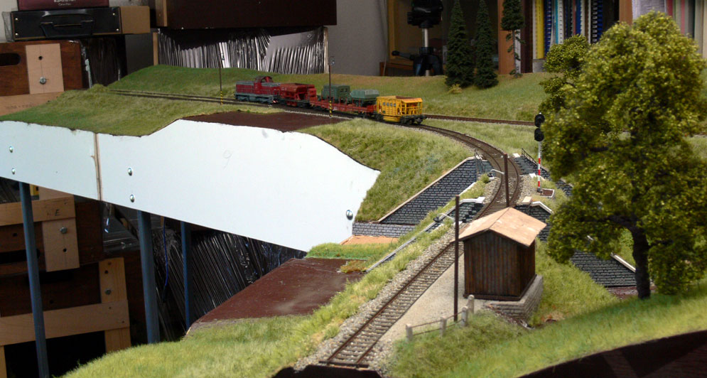 | Tak jsem se prokousal na díl "C" odbočky Morava, je to díl s dvěma mosty - ocelové s horní mostovkou a zastávkou Žleb. Tak jen jeden pohled do "rozvrtané" krajiny, řeka je schovaná za polystyrenovými odřezky. Nyní bude třeba udělat pilíře mostů, aby se "vyjasnila" krajina okolo pilířů. Traťové těleso je přes mosty průběžné, pouze je zúženo pro instalaci konstrukce mostu, důvodem bylo složité směrové vedení tratě. |