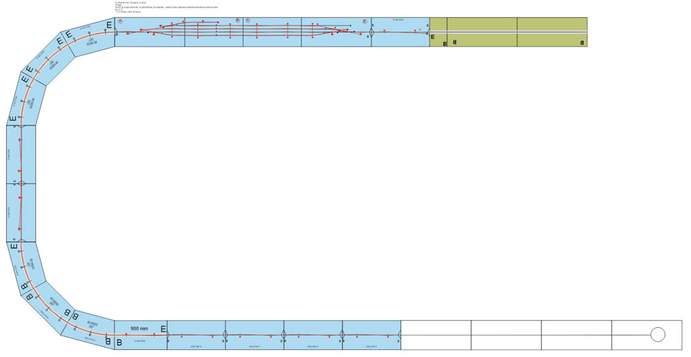 Minimální provozní sestava modulů "E-ČSD" (jsou ty modré), chybí tam ještě nájezd s napínáním u skryté stanice, zelené moduly již jsou klasické pokračování jednokolejné trati někam dál již bez TV, ve větším rozlišení návrh zde