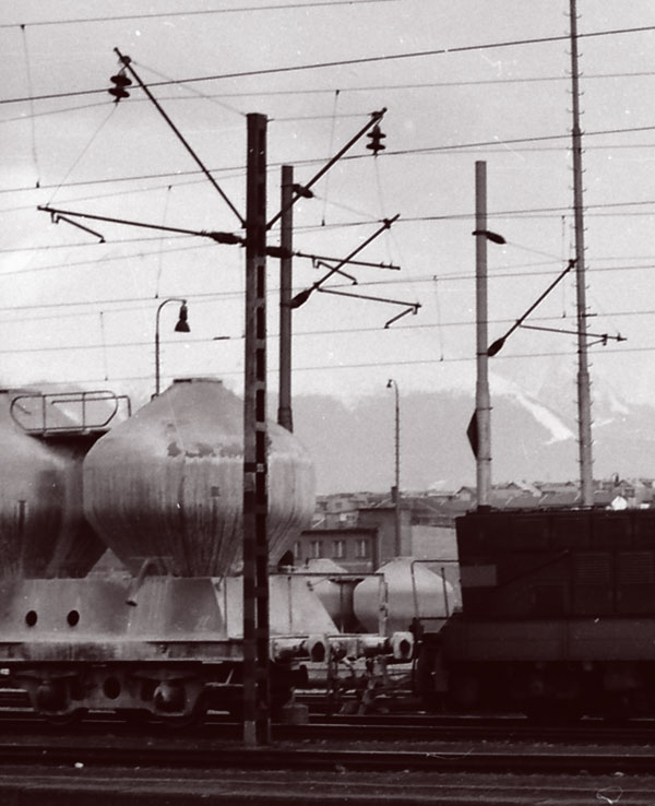 | Je jasné, že trolejové vedení je tak specifická záležitost a tak bude to vždy kompromis mezi modelovou věrností a nutností mít vedení pevné a být schopné k pojíždění sběračem lokomotivy. Navíc je to ovlivněno i modelovaným obdobím, dnešní v posledních 25 letech budované trolekové vedení je přece jen trochu odlišné od vedení používané od začátku elektrizace v 50. létech až do začátku 80. let. Dodnes jsou místy zbytky staré elektrizace se sloupy "D", ale již s novějšími výložníky, novějšími izolátory. podívejme se na fotografie ze začátku 70. let na různé komponenty, zejména sloupy. Pokud se jedná o samotné trolejové vedení, tak to je ruční výroba z bronzu CuSn6 (pružinová bronz) o průměru 0,3 mm a samozřejmě napínané ať již napínači továrními Sommerfeldt nebo závažím pod modulem. Pár fotek ze 70. let s trolejovým vedením, většinou stanice Poprad a okolí. |