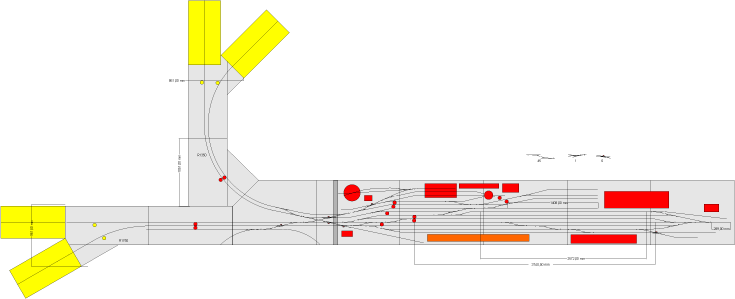 Délka staničních kolejí 1,2 a 3 je zkrácena na cca 2 m. Koncové profily jsou zaznačeny na nákresu, u profilu B'96 je vyšší hrana profilu na straně nápisu "B'96". Počítáno je s výhybkami PECO o poloměru odbočení 924 mm. |