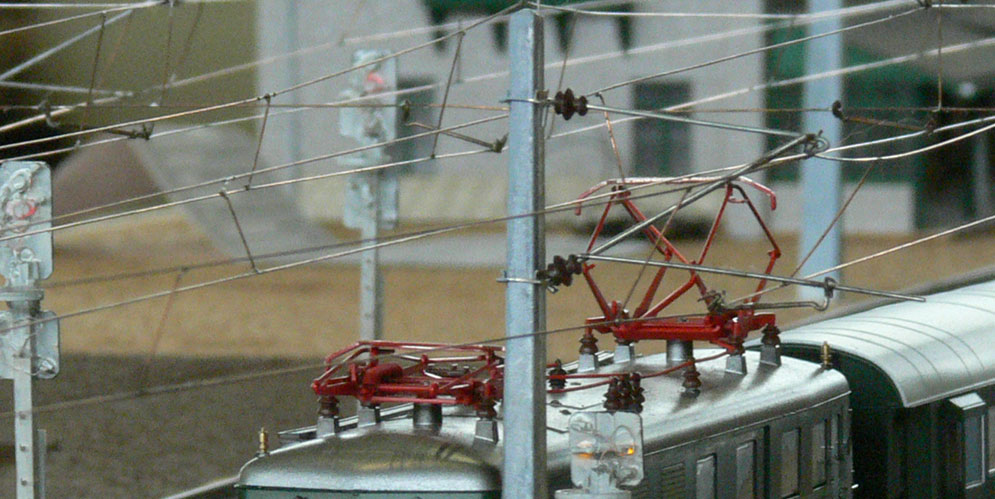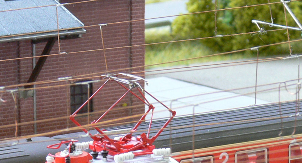 | Při detailním pohledu je vidět drobný společný problém trakčního vedení - usazují se na něm vlákna prachu, které pomalu tvoří drobnou pavučinku |