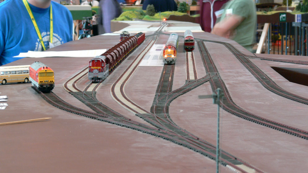 Druhý listopadový víkend patřil v sportovní hale v Hluku modulovému setkání H0 a H0e pořádaného pod hlavičkou Fremo. Moduliště bylo sestaveno z hlavní trati vedené mezi dvěmi skrytými stanicemi - Hrochův Týnec a Mikulovice. Z Lipové Lázní odbočovala trať do Luhačovic, na této trati byl vlečkový areál Hrabová. Z Řáholce odbočovala trať do Lokte a Chrudimi Města s krátkou odbočkou do stykové stanice s úzkým rozchodem - Beroun. za Chrudimí Městem se trať větvila na krátkou lokálku do Verneřic a trať do Bílého Potoka. |