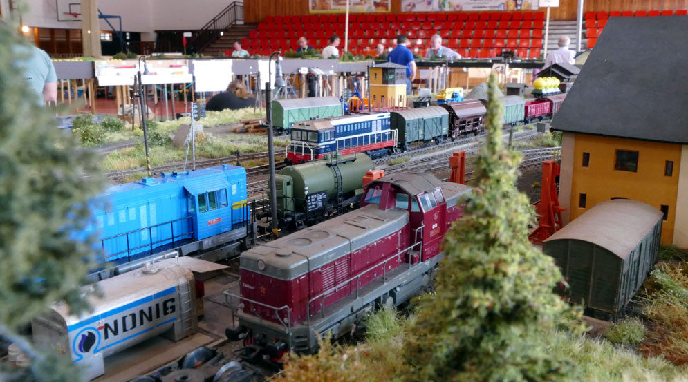 Již po páté bylo v Česku uspořádáno setkání modulů FREMO v městě Hluk na Slovácku. Jedná se o optimální místo pro takové setkání, kdy v jedné budově je hala, ubytování i restaurace. Letos bylo setkání uskutečněno pouze s moduly H0, chyběla úzká H0e. Datově bylo setkání zaměřeno na provoz v druhé polovině 70. let minulého století. Provoz byl organizován dle pravidel FREMO ve zkráceném čase 1:5. Grafikon byl postaven v délce 12 hodin modelového času od 6.00 do 18.00, tj. 2,4 hodiny skutečného času. |