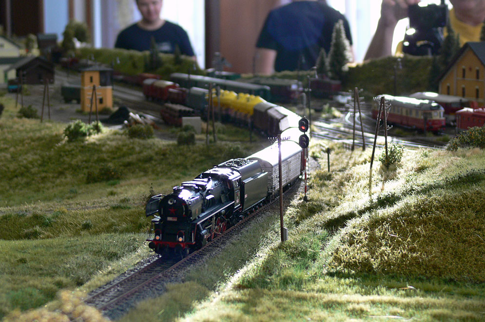 | Provoz: Vzhledem k rozsahu moduliště byla osobní doprava bohatá do mezinárodních expresů až po místní zastávkové vlaky. Vzhledem k polským kamarádům byl jeden pár mezinárodních expresů složen z vozů PKP a veden lokomotivou SP45.Nákaldní doprava byla směrována do obou skrytých stanic - vlakotvorných stanic, které byly propojeny dvěma páry průběžných nákladních vlaků. Pro provoz bylo potřeba dvanáct strojvedoucích a 9 obsluh stanic. Více o provozu v další dnech. |