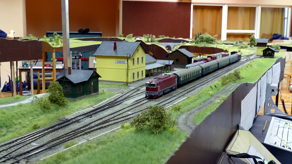 | Letošní modulové provozní setkání Hluk 2019, které proběhlo ve dnech 3. až 6.10.2019, bylo pořádáno modelářskými kluby zaměřenými na modulový provoz podle pravidel Fremo. Účastníci setkání byly zejména členové těchto klubů a pozvaní hosté, což byl jistý rozdíl proti předchozím letům, kdy tato setkání byla pořádána pod hlavičkou Fremo ve velké hale. Letošní ročník byl trochu komornější - pořádaný v malém sále. Jeho rozměry jsou cca 22 x 21 metrů což samozřejmě přineslo nutnost omezení počtu účastníků na 60 lidí. Tématem byl provoz v 80. létch minulého století na tratích ČSD v Československu. V modulišti byly zařazeny tři skryté stanice - Hrochův Týnec, Mikulovice a Bratislava filiálka, proto byly v modulišti dvě hlavní tratě Hrochův Týnec - Mikulovice a Hrochův Týnec - Bratislava filiálka, v úseku z Hrochova Týnce do Řáholce byla dvojkolejka, za Řáholcem na odbočce Lazy se tratě rozdělovaly. Ze stanice Jozefov byly odbočené mistní tratě do Kadaně s odbočkou Hukovice - Nevidov. Velkým kladem letošního setkání bylo, že všechny moduly byly "zelené", nikde nekazily vzhled moduliště holé moduly s pouze položenými kolejemi. |