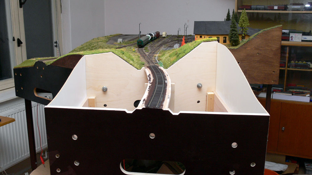 postup rekonstrukce: Ze dvou variant změn přechodových profilů byla zvolena úprava nastavením stávajících profilů na tvary zářezu (nenormalizované přechodový profil) a na standardizovaný Fremo přechodový profil "B". Klesající svah u přechodového profilu "B" směr Jeseník byl po předchozí úpravě boku modulu odříznut přímočarou pilkou. Nastavení je provedeno z překližky síly 10 mm, která je výztuhou a lepením připojena ke stávajícímu čelu dílu. Původní plochá krajina zhotovená tradiční metodou roštu ze styroduru s pokrytím napuštěným papírem byla z větší části ponechána a na ni stavěna nová žebra a výztuhy. Za depem byl vsazen nový díl boku modulu z MDF (zvětšil se tam kopec) a dotmelen k stávajícímu boku (tmel Ostafix). Na nové části krajiny byla připravena trasa polní cesty vedoucí od východní hrany dílu přes obě trati na Javorník a Jeseník do kopce za depem. Po zhotovení kostry krajiny byla krajina pokryta papírem napuštěným zředěným lepidlem (Duvilax). Zde byly opět použity projeté papírové jízdenky ČD. Po vyschnutí lepidla dojde k vypnutí papírového povrchu, který je díky napuštění (oboustranné natření před lepením, kostra je předetřena neředěným lepidlem Duvilax) poměrně tuhý. Drobné nedostatky jsou před i po přelepení tmeleny (Ostafix). Na takto připravený povrch je možné provádět "zatravnění" a to jak historickou metodou - posyp barveným molitanem a přestřik ředěným lakem (Sportakryl matný), tak flockováním, případně i foliáži. Na Lipové je použita pouze foliáž (foliáže Polák - různé louky, pole a strukturstat) jako současný nejvěrnější způsob znázornění pokrytí povrchu rostlinstvem. Nutno dodat, že patří k těm finančně nákladnějším a časově náročnějším technologiím. |
