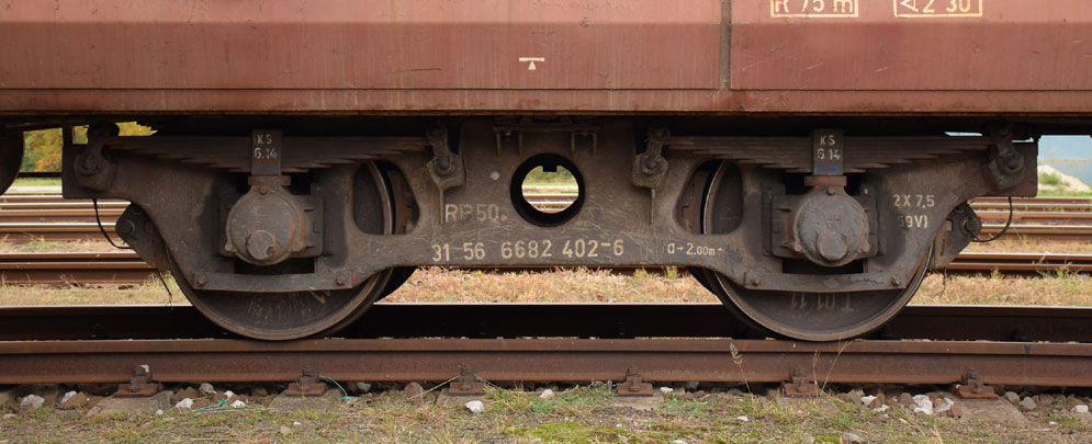 Jak vlastně patina na vozech vzniká v reálu? Na železničních vozech se postupem času (někdy dříve někdy později – dle charteru provozu) začínají objevovat nánosy prachu, který má černo-hnědo-rezavý odstín. Tento jemný tmavě rezavý prach pochází především z brzdových špalíků otěrem o ocelová dvojkolí vozidel. Brzdové špalíky se vyrábějí jako odlitek z litiny, který je usazen a zajištěn v tzv. botce, která je vyrobena rovněž z oceli. Během jízdy vlaku či posunového dílu je zapotřebí regulovat rychlost jízdy. To je docíleno tahem a nebo brzděním (pominu-li EDB) tak, že strojvedoucí sníží tlak v hlavním (průběžném) potrubí (to jsou ty červené kohouty na čelnících) z 5 barů o určitou hodnotu. U vozidel, jež jsou zapojena do průběžné brzdy reagují na tuto tlakovou změnu jejich rozvaděče, jež vpustí tlakový vzduch do brzdových válců. Ty pomocí pákové soustavy mechanické části brzdy, kterou je vybaveno každé obržděné vozidlo způsobí, že brzdové špalíky dosednou na otáčející se dvojkolí. Vzniklým třením se snižuje rychlost vozidel, vytváří se teplo a uvolňují se částečky prachu z litinových zdrží. Ten začne vlivem proudění vzduchu během jízdy po čase ulpívat na různých částech vozu, prvně na pojezdu vozidla a posléze i na vodorovných a sešikmených plochách (podélníky rámu, viditelné výztuhy rámu, vrchní části zábradlí, bruknách, vrchní části brzdařských budek, stříšek apod. Zkrátka do míst, kde sedne tento rezavý prach a může se na něj dostat dešťová voda. Vozidlová dvojkolí resp. jejich obruče jsou spolu s brzdovými špalíky tepelně namáhané, z hlediska modelářského je jejich odstín za normálních provozních okolností tmavě rezavý až lehce černý, disk kola je spíše do černa. Světlá rez je obecně čerstvou stopou po nějakém mechanickém namáhání kovového povrchu, rezavý kov tmavne až po určitém čase. Příklad podvozku pod provozním vozem Wap z vagonky Poprad 11.sk. |
