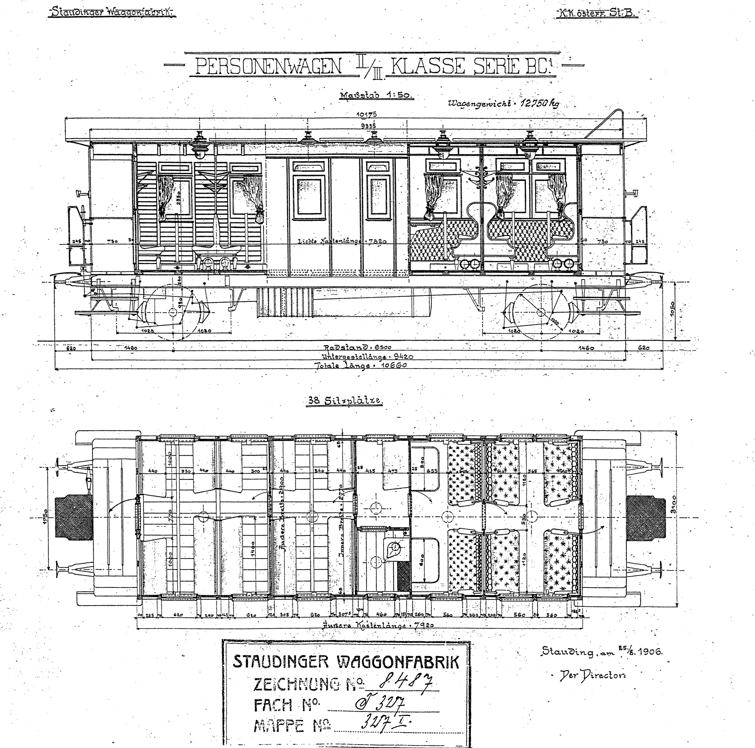 | Typový výkres neboli výkres 1:50 vozu BCi s rozvorem 6,5 metru, zde ve vyšším rozlišení, na těchto výkresech jsou kresleny polohy plynových lamp. | |