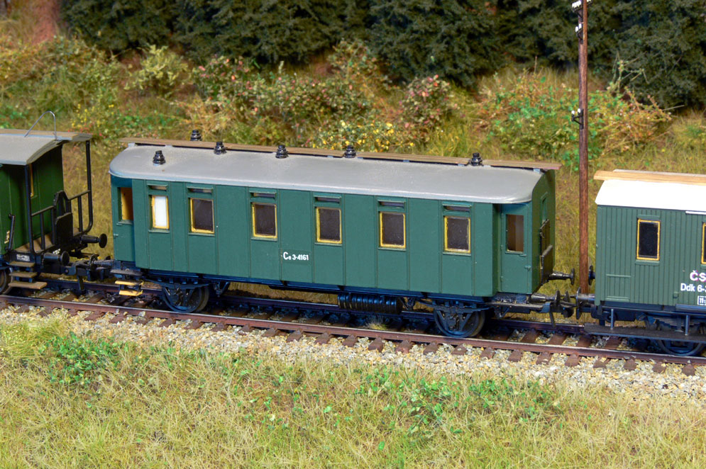 | Vůz Ci s rozvorem 6,5, výrobně pozdější (nehledal jsem data výroby ani tohoto vozu ani vozu BCi), ale rozdíl je patrný na první pohled - zábradlí plošiny, přechodový můstek, pojezd, plynové osvětlení - to je ten velký válec - plynojem, na střeše vršky plynových lamp... Provedení plošiny u dílů vozů ADA odpovídá tomuto vozu. | |
